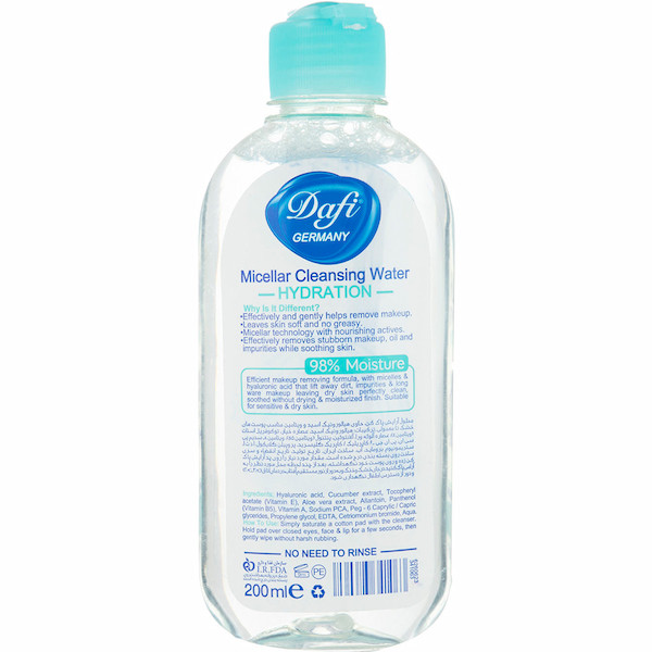 میسلار واتر پوست خشک تا نرمال دافی علاوه بر این که پاک کننده آرایش است، التیام بخش پوست های خشک تا نرمال نیز می باشد و باعث ایجاد تحمل پذیری بالا برای پوست می شود. اگر شما پوستی حساس و تحریک پذیر دارید این میسلار واتر با پوست شما بسیار سازگار است و به دلیل دارا بودن آنتی اکسیدان از پوست در برابر رادیکال های آزاد محافظت نموده و سوزش و قرمزی پوست شما را کاهش می دهد و همچنین حس طراوت و شادابی را به پوست شما بازمی گرداند. این میسلار برای پاک کردن انواع آرایش صورت، چشم ها و لب ها کابرد دارد و به راحتی آرایش های ضد آب را نیز پاک می کند.